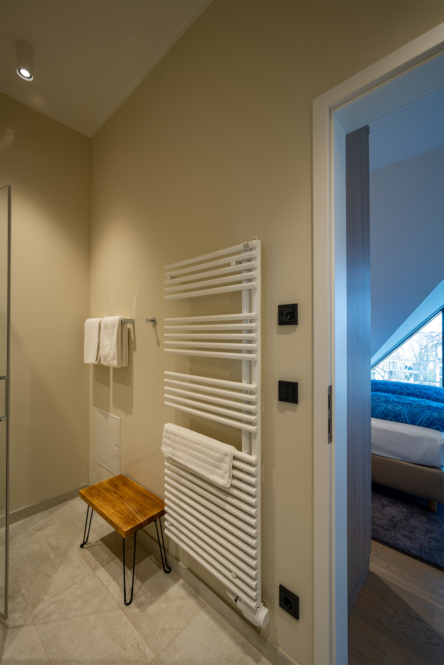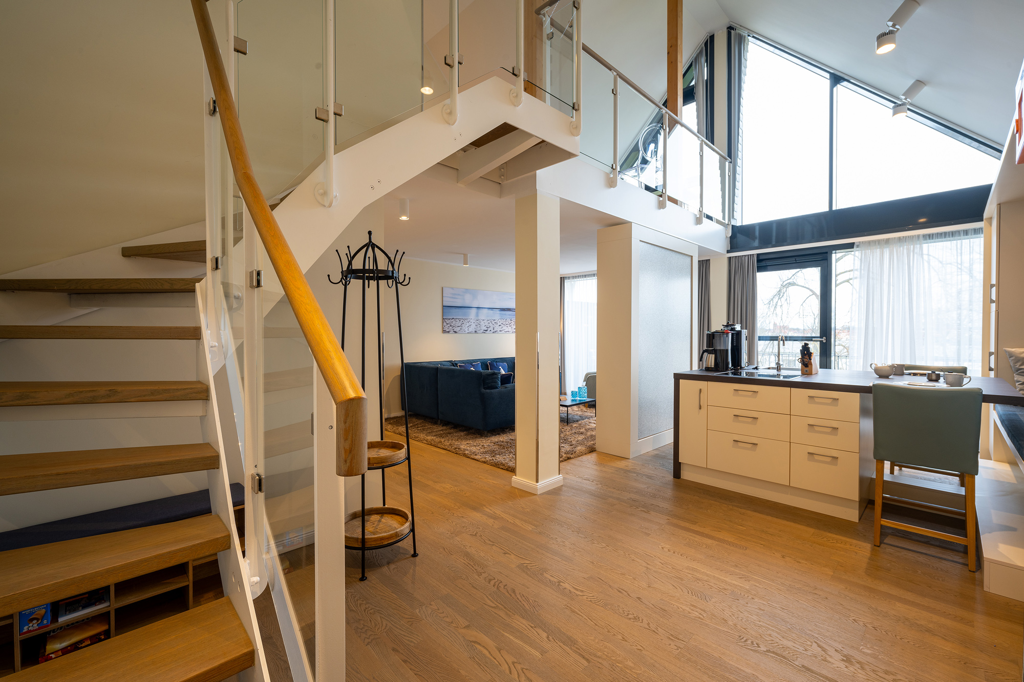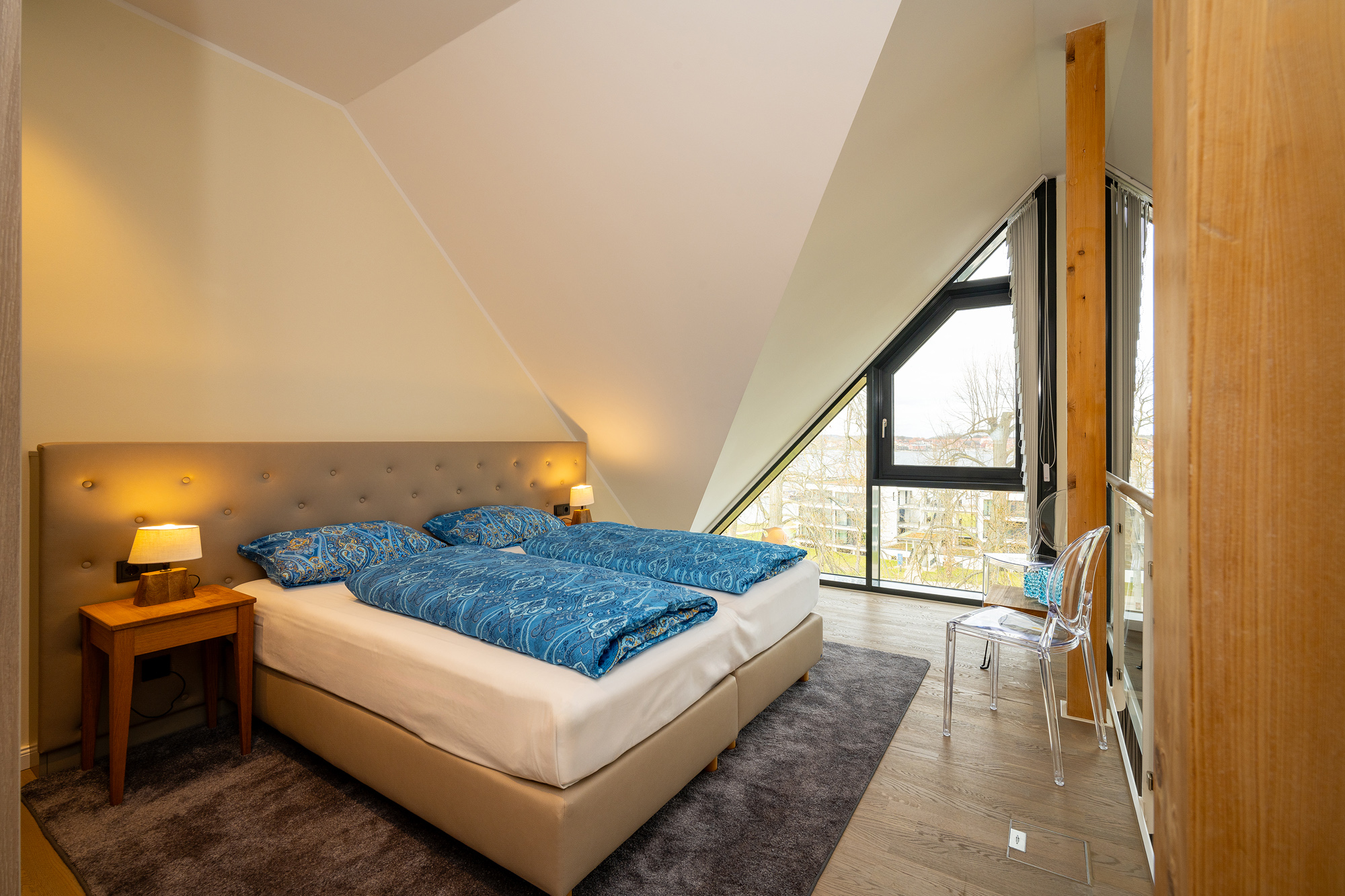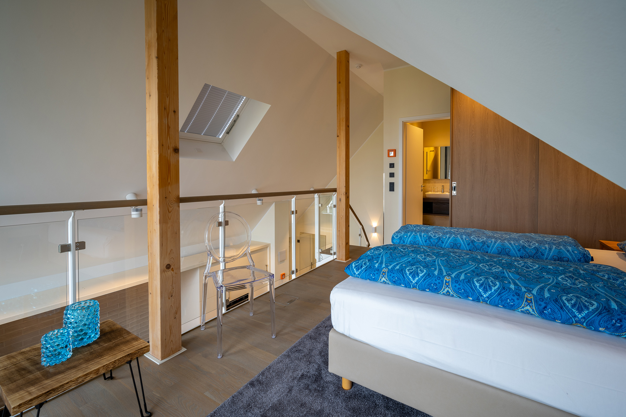 Der auf der Empore gelegene Schlafbereich mit Müritzblick ist ein bequemes Doppelbett mit Bassetti und Möve Bettwäsche. Die Nachtischlampen, die transparenten Stühle und ein schöner Holztisch mit Windlichtern in Meeresfarbe von Skogsberg, lassen eine schöne Atmosphäre entstehen. Das Ensuitebad mit Dusche ist modern eingerichtet und mit Möve Handtüchern in Kornblumenblau ausgestattet.