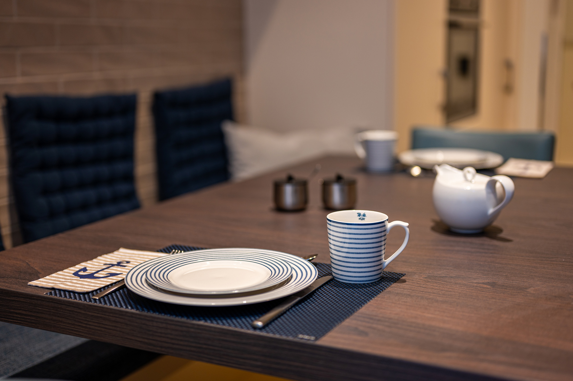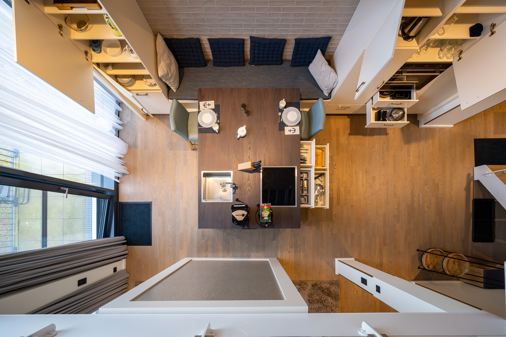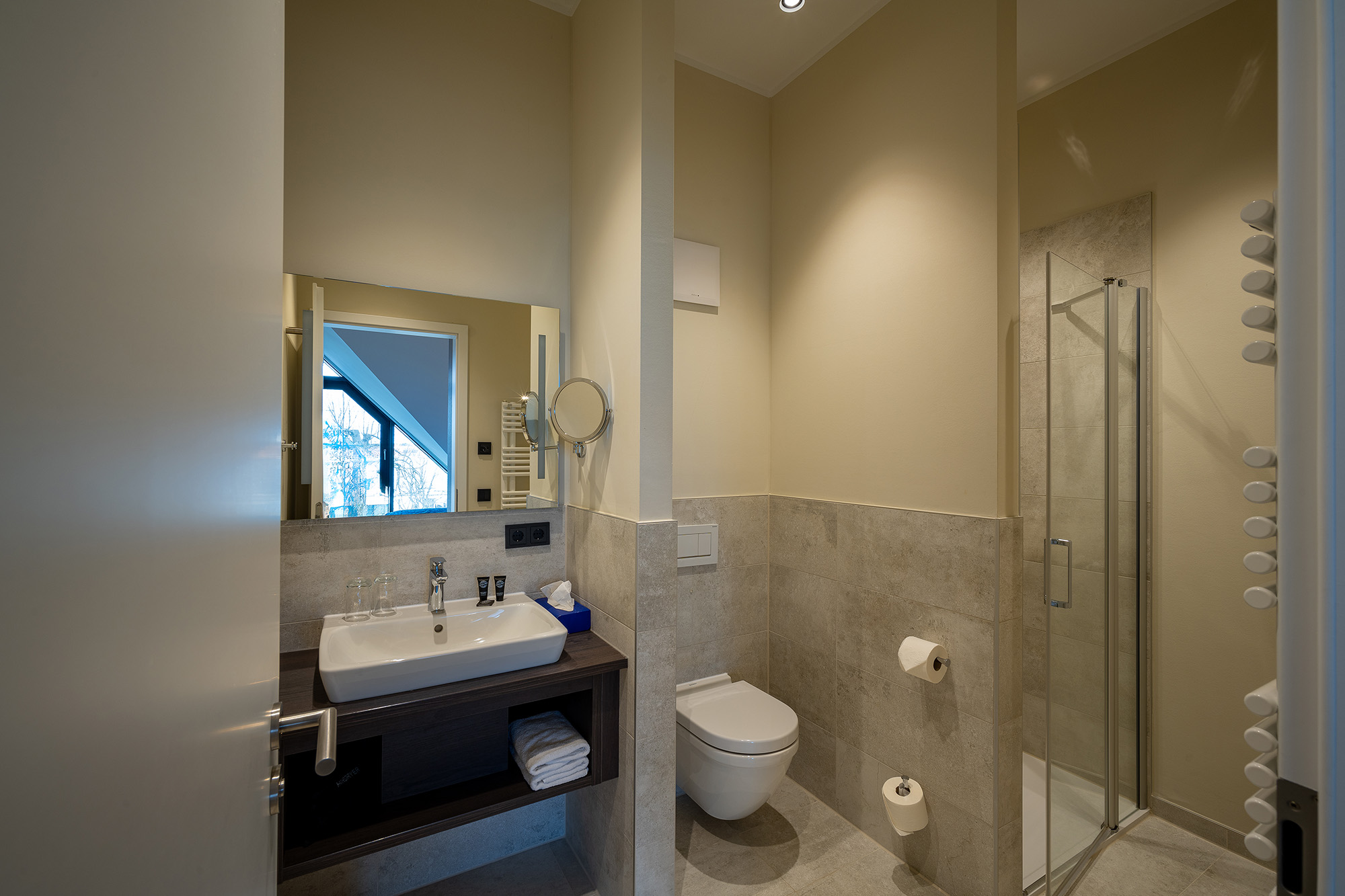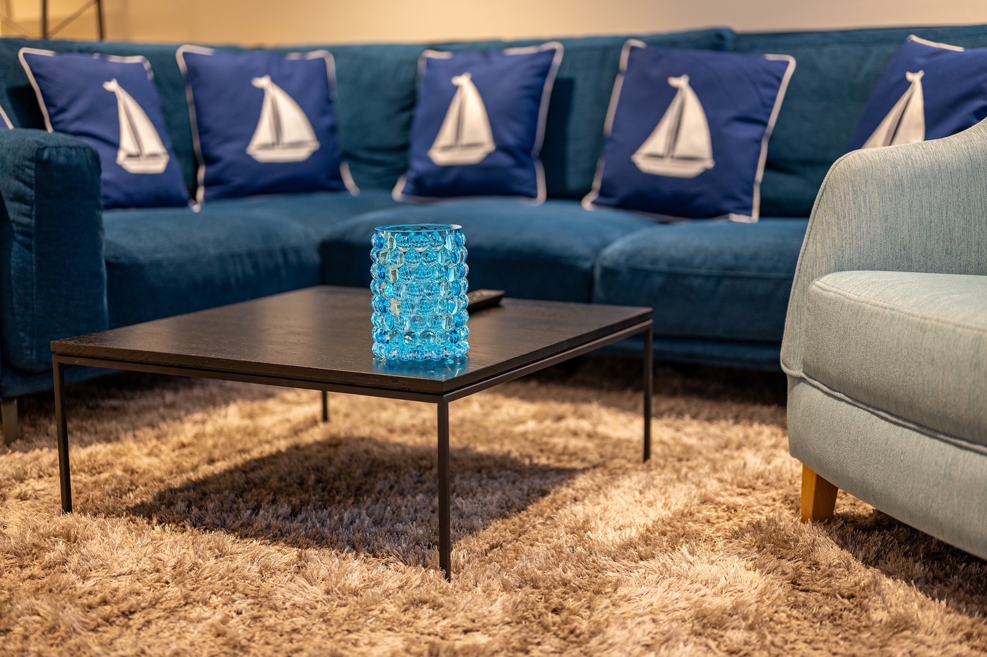 Der auf der Empore gelegene Schlafbereich mit Müritzblick ist ein bequemes Doppelbett mit Bassetti und Möve Bettwäsche. Die Nachtischlampen, die transparenten Stühle und ein schöner Holztisch mit Windlichtern in Meeresfarbe von Skogsberg, lassen eine schöne Atmosphäre entstehen. Das Ensuitebad mit Dusche ist modern eingerichtet und mit Möve Handtüchern in Kornblumenblau ausgestattet.
