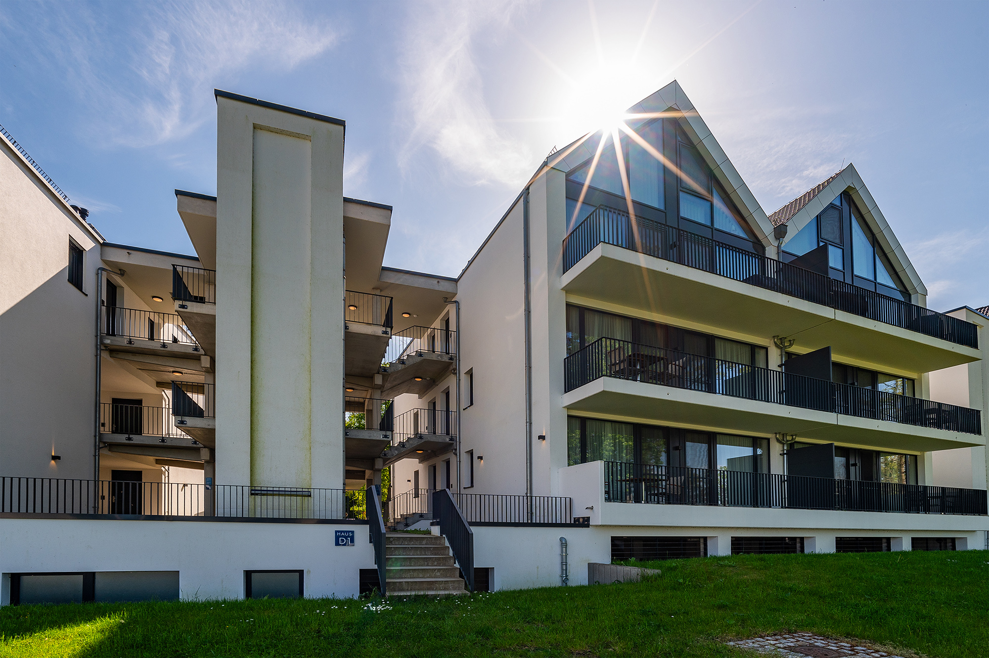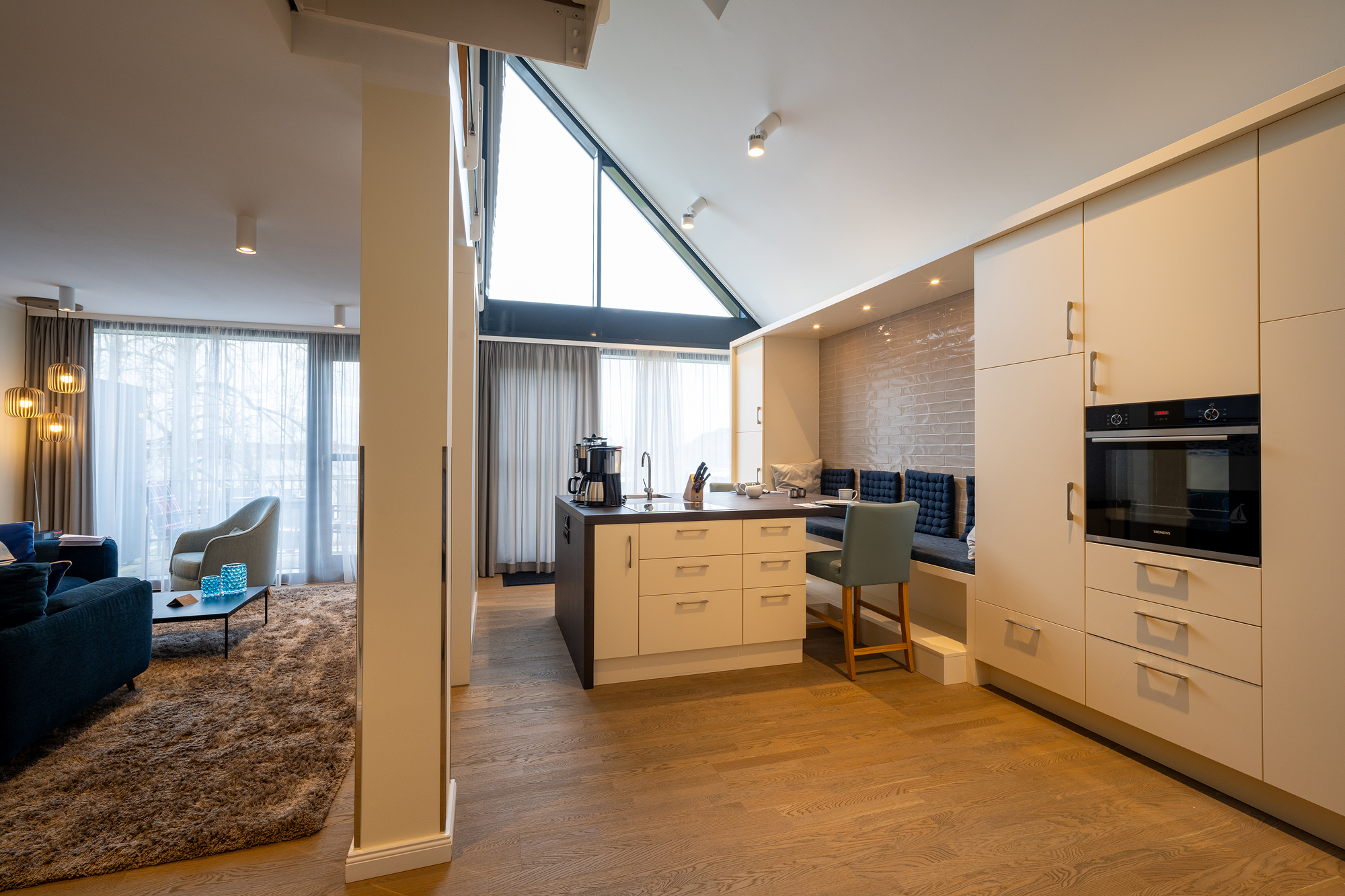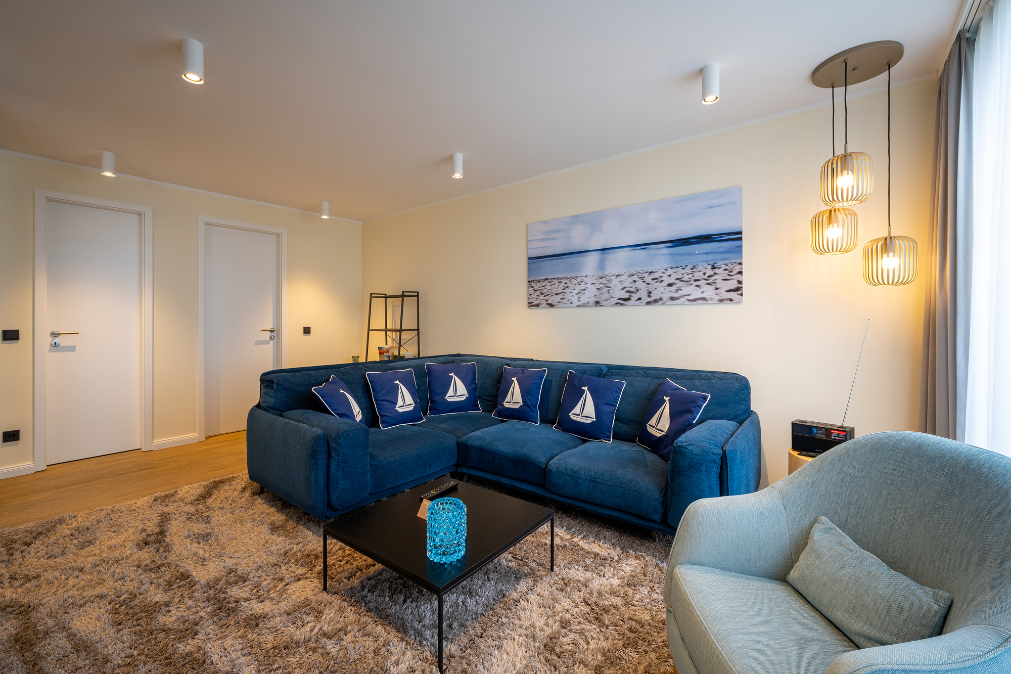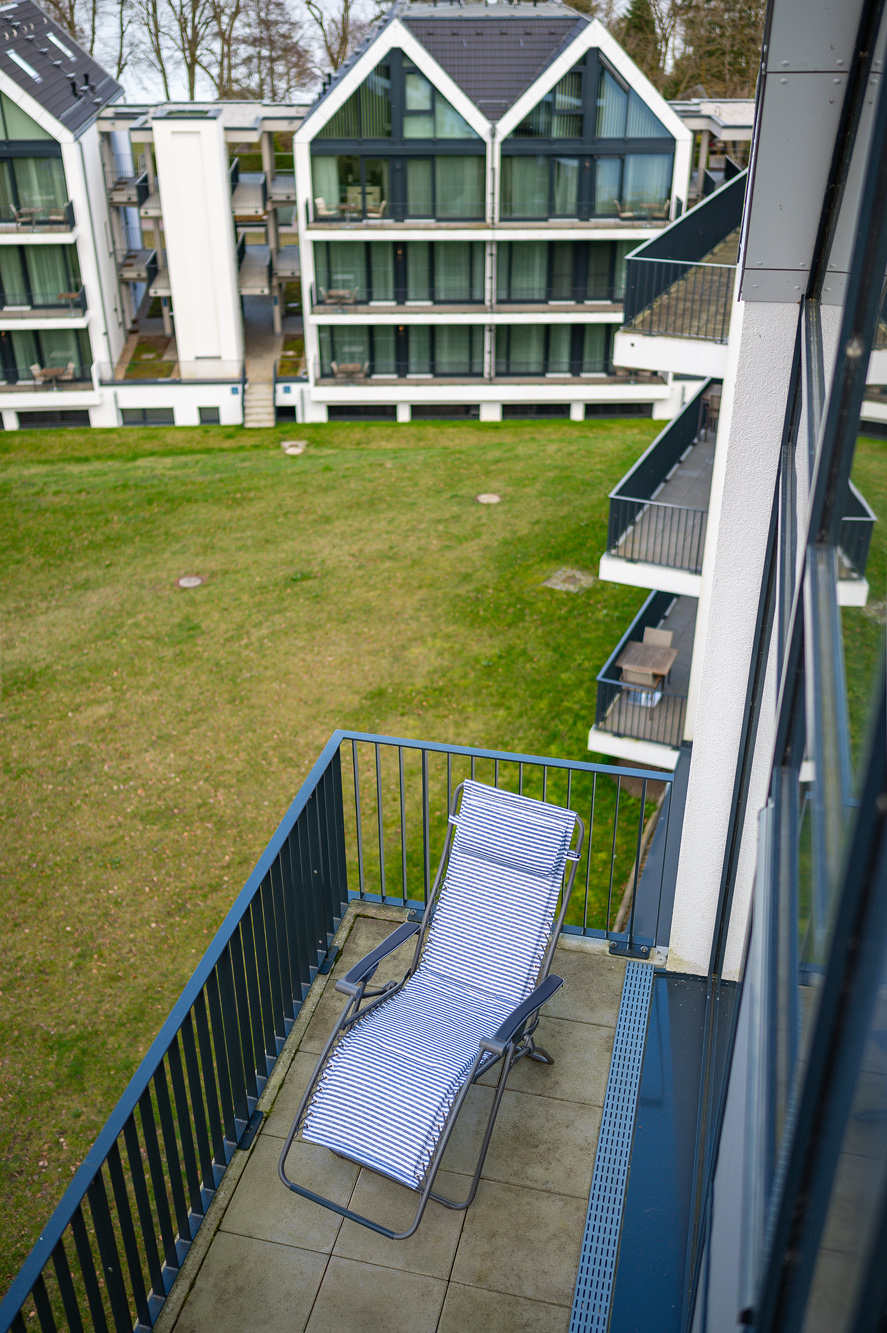 Die moderne, gemütliche, komplett eingerichtete Unterkunft lädt zu einem erholsamen Urlaub ein. Die Ausstattung lässt keine Wünsche offen: moderner Garderobenbereich, Durchgang zum Wohnzimmer, auf den Balkon mit Teakmöbel und Sonnnenliege, offene Wohn-Essbereich mit Working-Space Möglichkeit, um auch in den Ferien wichtige Arbeiten erledigen zu können, gemütlicher Wohnbereich mit Bücherregal, Gäste WC und Hauswirtschaftsraum mit Wäschetrockner, Staubsauger, Reinigungsutensilien. In der oberen Etage befindet sich der Schlafbereich mit großem Schrank, Bettwäsche von Bassetti und Möve verhelfen zu einem erholsamen Schlaf. Für die Nutzung des Schwimm- und Saunabereiches stehen Bademäntel und Saunatücher in Kornblumenblau zur Verfügung. Im Bad mit Dusche sind Frotteewaren der Firma Möve ebenso in Kornblumenblau gehalten. Im Mietpreis ist die Mitbenutzung von Schwimmbad und Sauna inbegriffen.